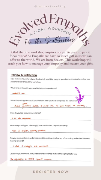 Use all the knowledge and tools you have learned from the workshop and create your personalised Empath Framework that would support to you becoming the Evolved Empath you can be. -